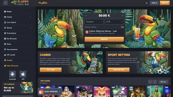 I vÄr lobby hittar du mer Àn 7 500 spel, inklusive spelautomater, livebord och crash-liknande titlar. Sportspel finns ocksÄ tillgÀngligt med ett konto och en plÄnbok, sÄ du behöver inga separata inloggningar. Om du letar efter Flappy Casino Sverige-alternativ med moderna leverantörer och tydliga grÀnser Àr vi anpassade för insÀttningar i EUR och snabba utbetalningar via e-plÄnbok.