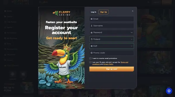 - Ăppna registreringsformulĂ€ret pĂ„ vĂ„r Flappy Casino onlinecasino-startsida.